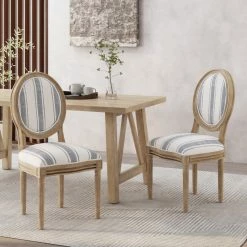 GDFStudio Lariya French Country Fabric Dining Chairs (Set Of 2), Dark Blue Line + Natural