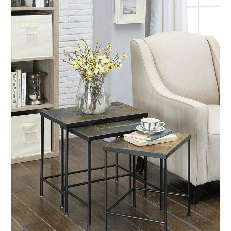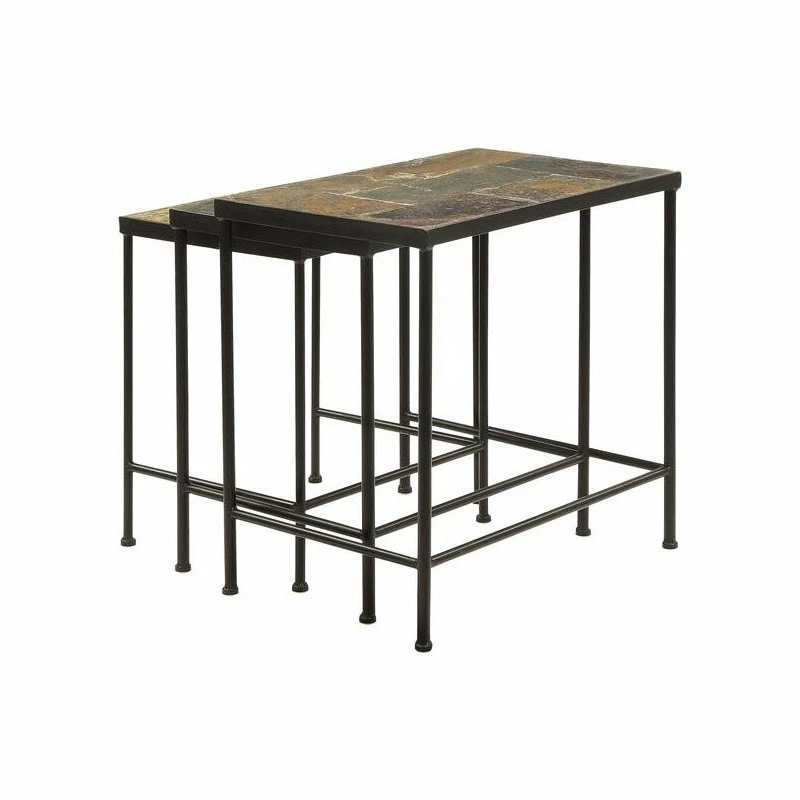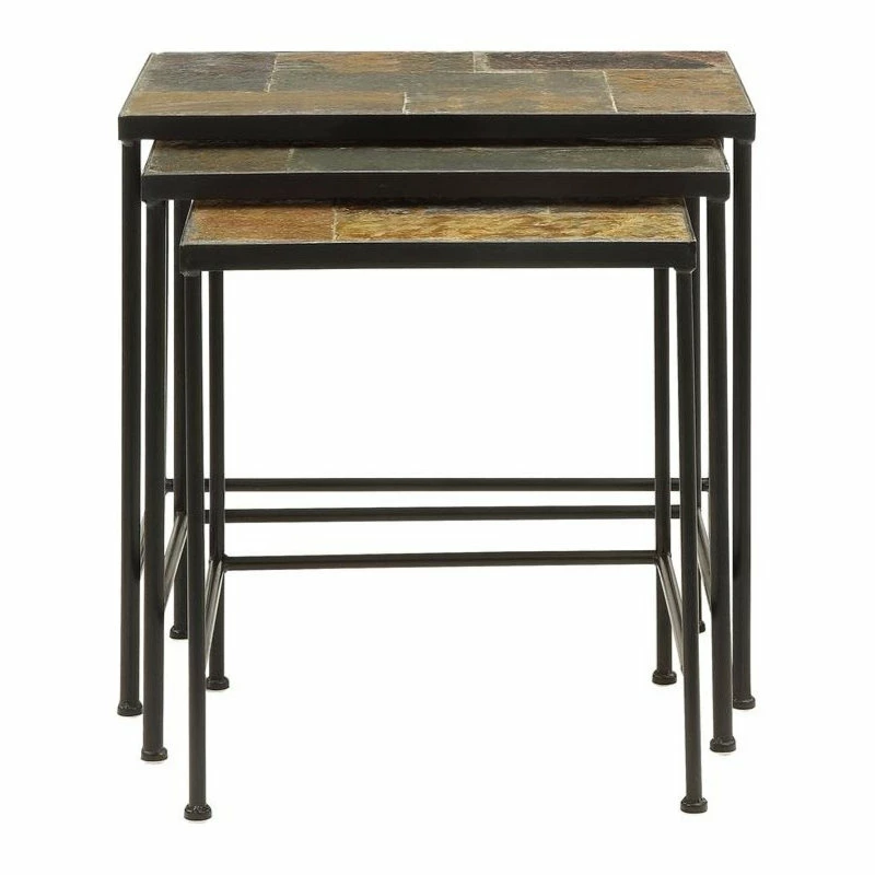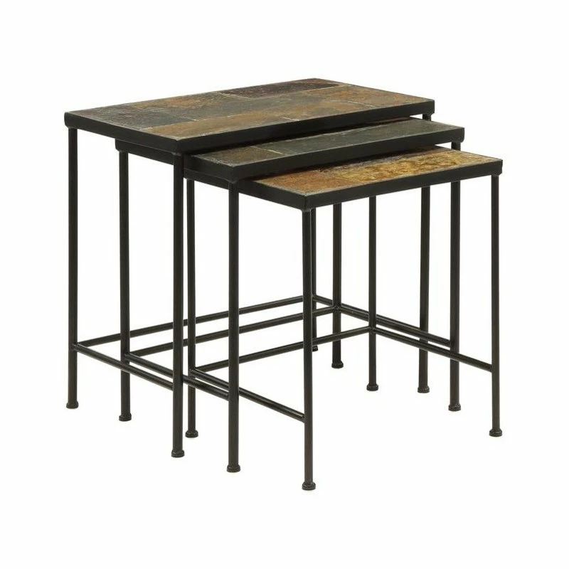 What a beautifully crafted rectangle steel and natural rustic slate nesting tables. This set of 3 tables are perfect for any room of the house and will help meet your our entertaining needs. The metal is finished in a rich powder coated black which gives it a distinct look. The three tables heights are perfect for nesting. The three sided metal frames at the bottom gives the units the stability needed for the tables. Constructed of metal and stone. Clean with a dry non abrasive cloth. Comes fully assembled.