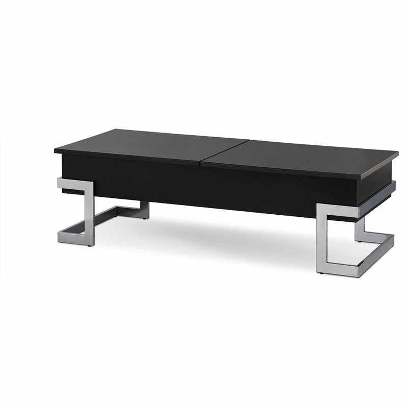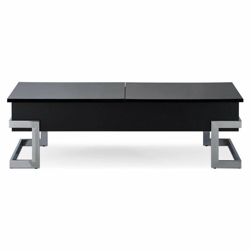 The Calnan coffee table has it all, good looks with its chrome modern legs exposed on the outside of a black box top. Full of surprises, like lift top tray and slide top storage with additional storage under the lift up tray. This table will ensure your living area remains clutter free.