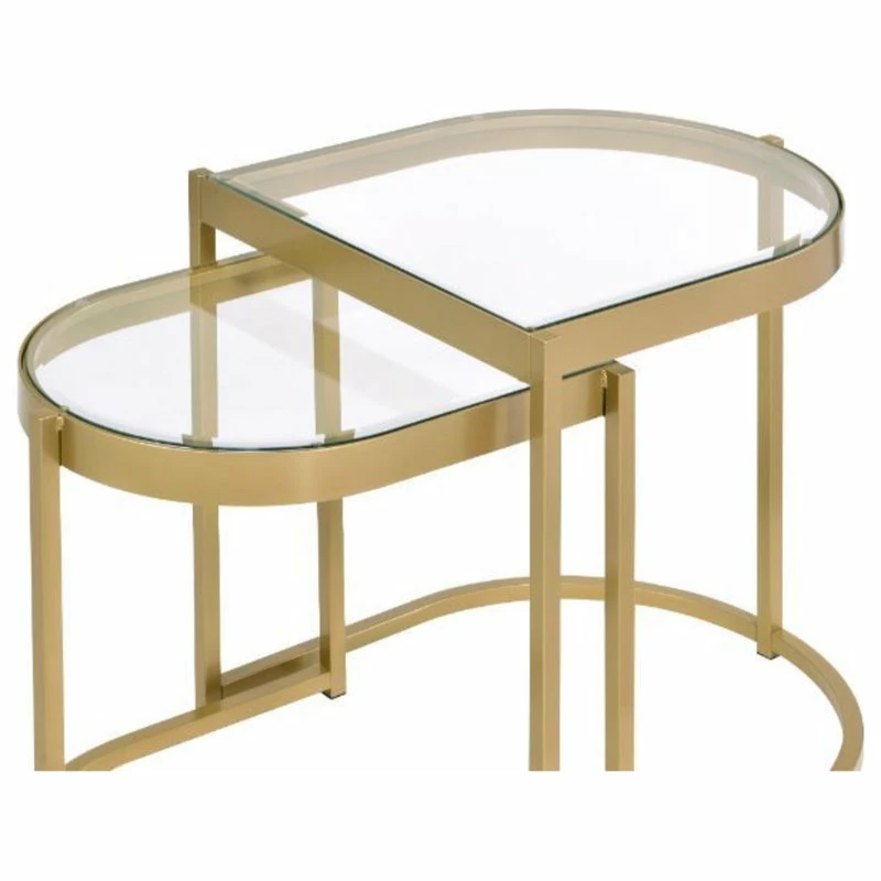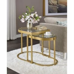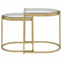 Explore modern simplicity that easily improve the overall room aesthetic. The Nesting Table set features half oval shaped table top with metal frame base that offers a balance of grace and strength. An alluring gold finish showcases it’s clean-lined silhouette, while clear glass table top reflects light and makes any room appear larger. The nesting table set will become a stylish and irreplaceable element of any interior.
