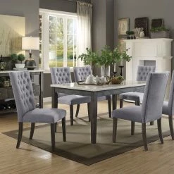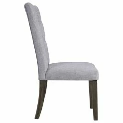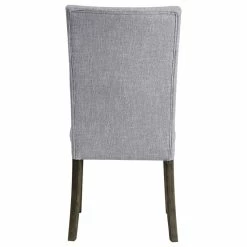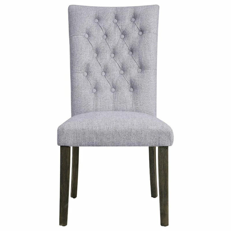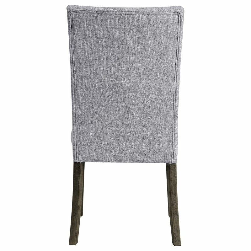 Attract attention to your dining room with the Merel side chair. Featuring a stunning button tufted gray backrest and classic gray oak finish wood legs, this chair is both durable and stylish, complementing your contemporary home decor theme while guaranteeing to withstand the wear and tear of daily use for years to come. Warmed with a gray oak finish this sturdy armless chair has beautifully tapered wood legs. A striking mix of natural materials this unique chair will provide comfortable seating for all of your guests. Sold in sets of two.