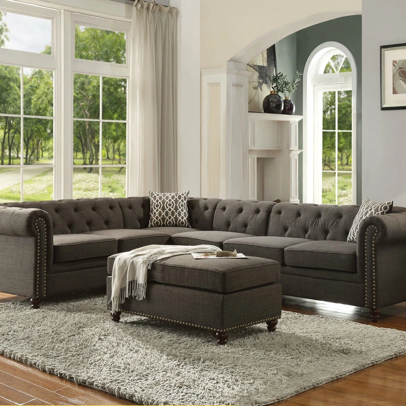 Indulge in the softly textured linen coating, and breathe fresh air on this Aurelia II sectional sofa. With pocket coil seating and button tufting for comfortable support, the sofa features tight back and loose seat cushion with rolled armrests, fully upholstered in a charcoal linen to achieve ultimate comfort. Nail-head trim accent adds a little vintage charm to this piece. Treat yourself to the luxury and comfort of Aurelia II Sectional Sofa.