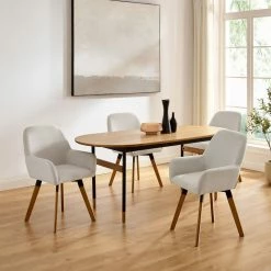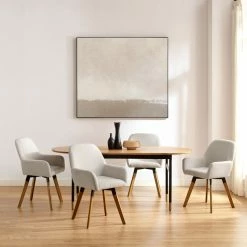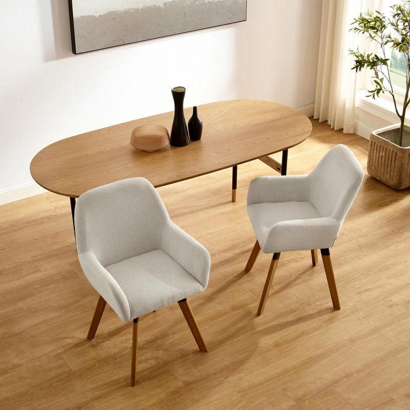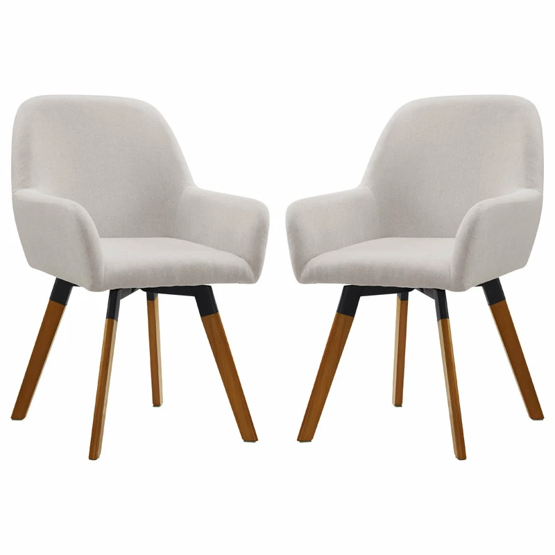 Bring a touch of mid-century modern vibe to your dining room or kitchen with this set of 2 dining chairs. Featuring soft Linen upholstery bucket-shaped seat with high-density foam padding, these kitchen chairs offer you a comfortable seat to relax or lounge. Solid splayed Beech legs with a natural finish add extra durability and sturdiness. The swivel seat can spin 360 degrees ensuring easy mobility. Blend classic elegant clean-lined design and practical function to your living room, dining room, home office, vanity, or bedroom with these armed dining chairs for extra cozy seating.