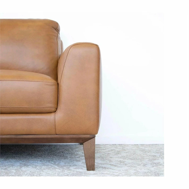 This modern wide bumper couch made of top tan leather upholstered and elegant solid wood legs in walnut color creates an inviting space as game room furniture for entertainment activities. This sectional sofa create spaces in big and small homes, apartment living game room urban loft condo.
