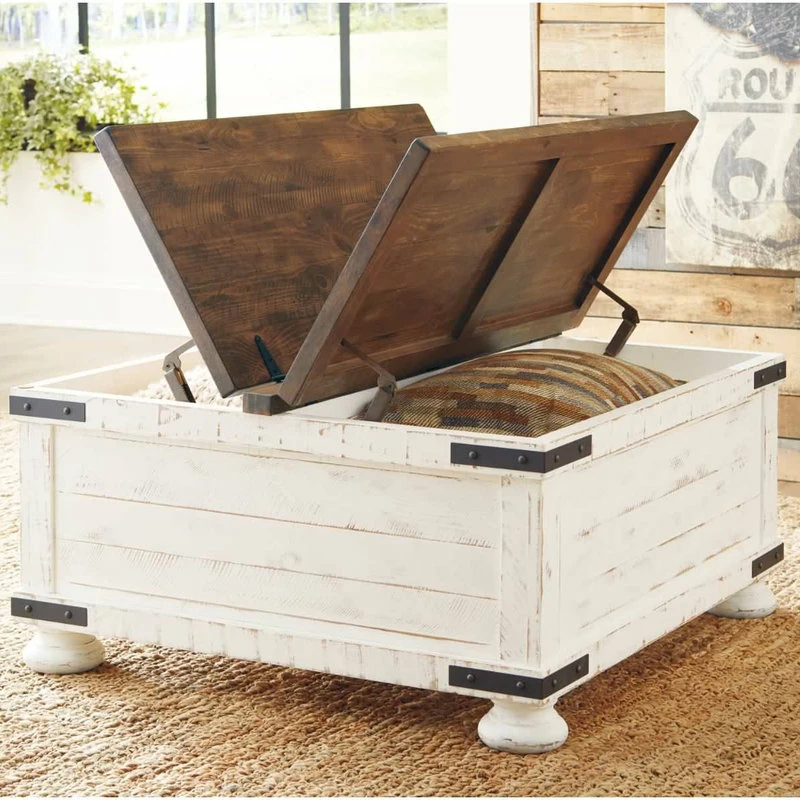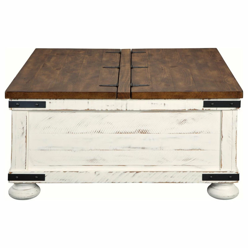 Double take. Sporting a two-tone finish, dual-sided lid design and expansive storage space, this square coffee table takes the art of rustic farmhouse living to a new level. Designer touches include plank-effect styling, heavy distressing and industrial bracket hardware.