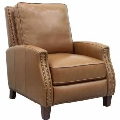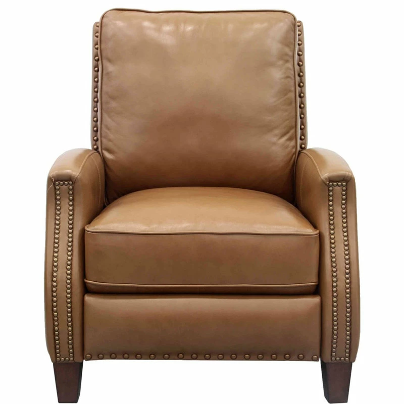 Smaller scale 3-way transitional recliner with footrest extension. Attached welted pillow back, shaped track arms, tight welted box seat cushion with pocket coil springs and a down blend feather wrap for plush comfort and lasting durability. Large distressed nail head trim accents the back and coordinating smaller scale nail head trim outlines the shape of the arm, the bottom of the side rails and ottoman. The tapered wood legs have a distressed old-world finish.