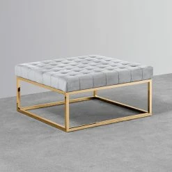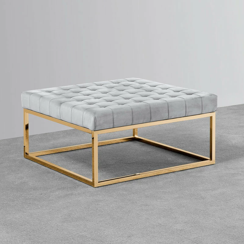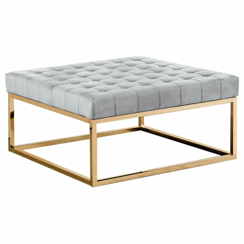 This contemporary and versatile ottoman coffee table is upholstered in velvet fabric and made of manufactured wood frame. The base is in a gold finish made of metal. With a large surface to use as a coffee table or relax your feet, this piece is an essential piece of furniture to your living room space. The eye catching gold base is what makes this ottoman coffee table special.