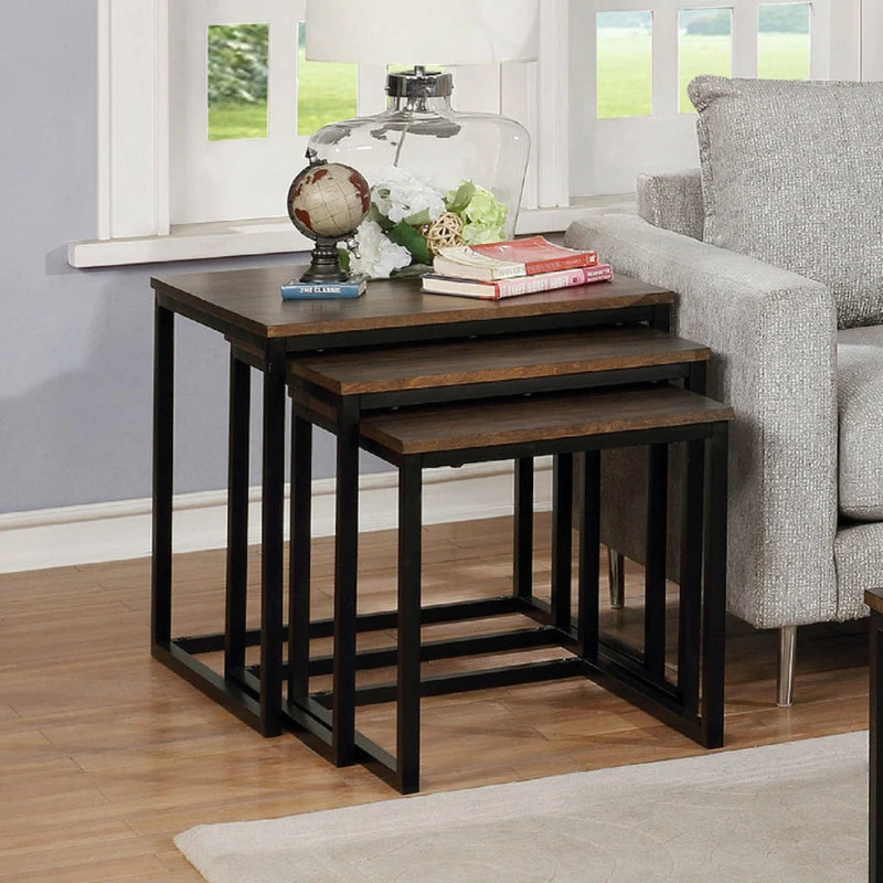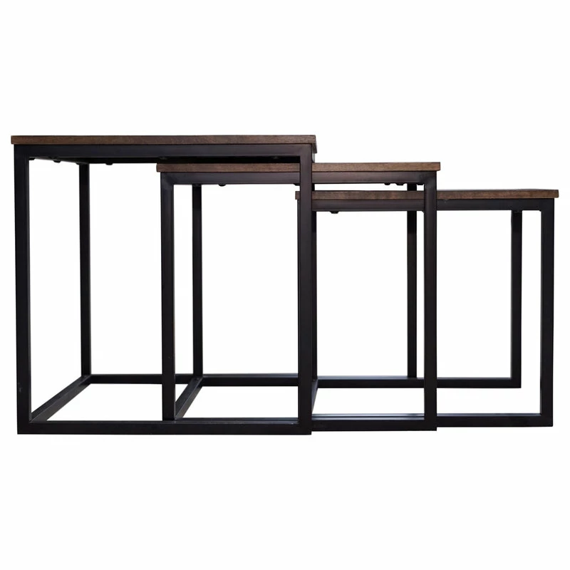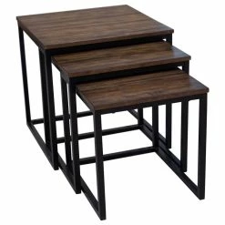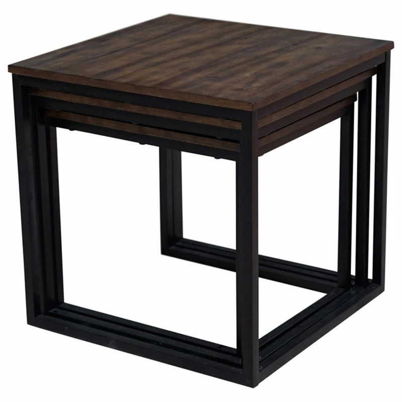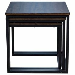 Designer, industrial style in these gorgeous dark-stained nesting tables with metal legs. Perfect for entertaining the nested tables can be used for seating or serving. The Arcadia collection features pieces that are boldly sized to make a strong statement in your living space. The metal, sled legs on each piece and dark colors create a streamlined look. These are the perfect pieces for for a clean, modern space.