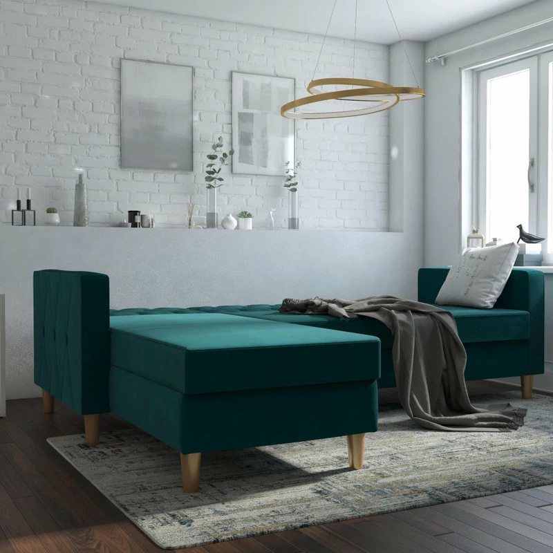 You need this CosmoLiving Liberty Sectional Futon with Storage. It’s simple, stylish and the perfect small space solution with its compact design and functional features. Choose between a fierce green velvet, blush pink velvet, ivory velvet, black velvet or light grey chenille finish with delicately crafted diamond tufting and brass legs for a #flawless Insta-worthy look. The chaise can be configured to set up on either side of the futon and the wide storage compartment is perfect to hold off-season clothing (or that laundry you needed to do, like yesterday). The adjustable back allows you to recline to kick it comfortably or lie flat for the best night sleep you never had…