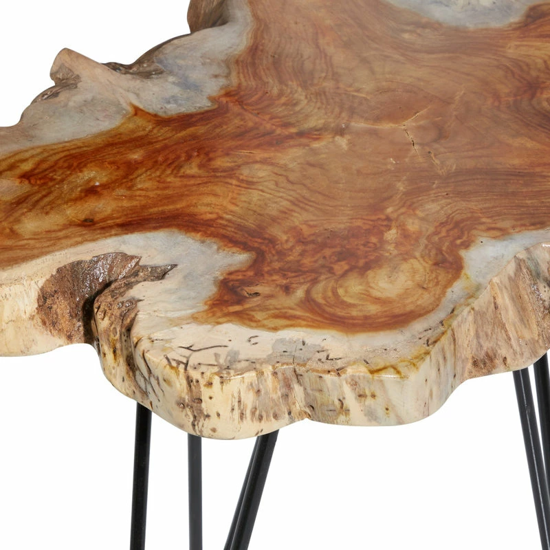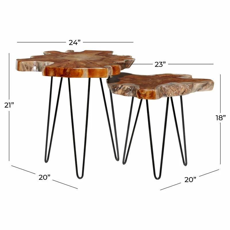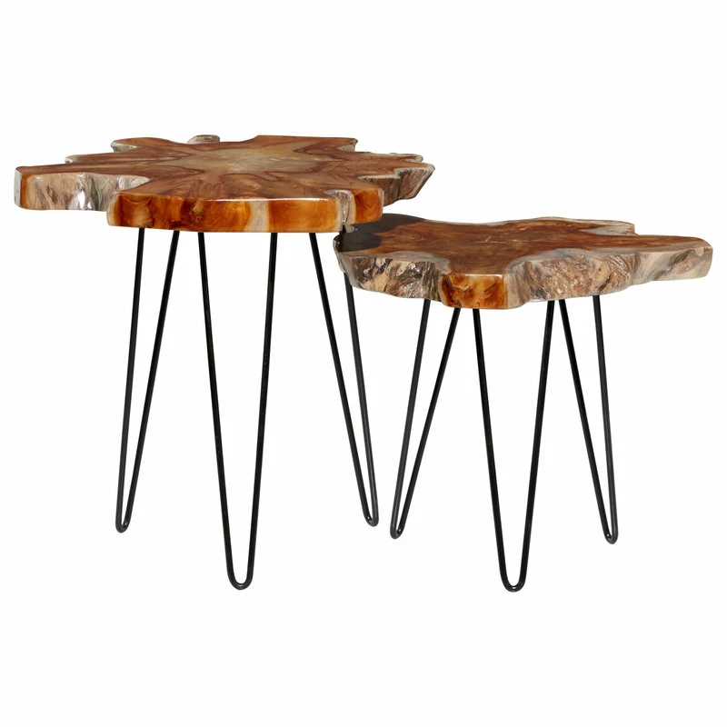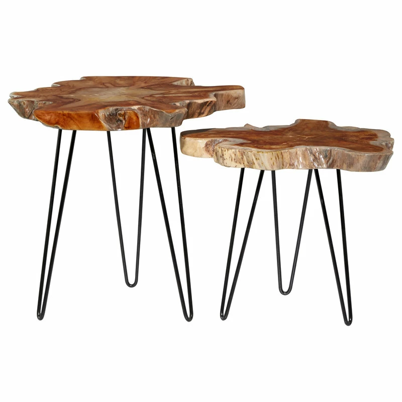 Useful and elegant, side tables are more than just a place to throw your mail or place a lamp. Use it as an accent piece in the living room, library, bedroom, waiting areas, or hallways of your home . Give your naturalist style inspired home an upgrade in any room with these Teak and metal side tables. Design with curved metal legs for maximum stability. This item comes shipped in 1 carton. Suitable for indoor use only. Due to the live edges of the piece, each is unique, so no two products will have an identical pattern, shade, or cut. Maximum weight limit is 50 lbs. Made in Indonesia. Each set comes with 2 Teak wood side tables. Contemporary design.