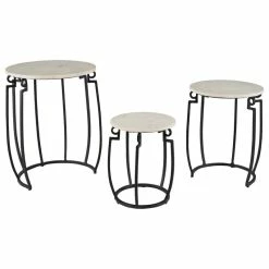 Nestled one inside the other, or separated to put in different spots, the ease and convenience of nesting tables has long been a household favorite. And now we have given them a new contemporary look with round beveled white marble tops held aloft by contrasting Ponga Black metal bases in a unique open caged frame. Ideal for any room, any decor, any time.