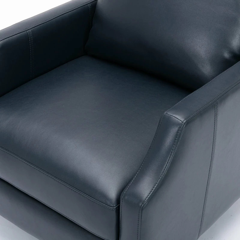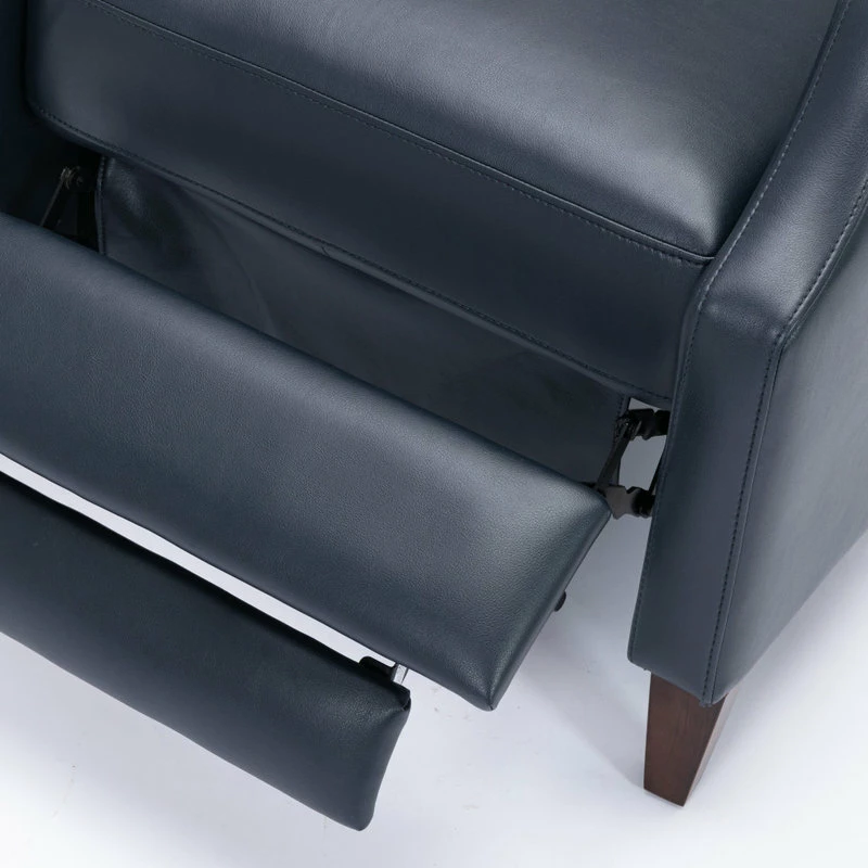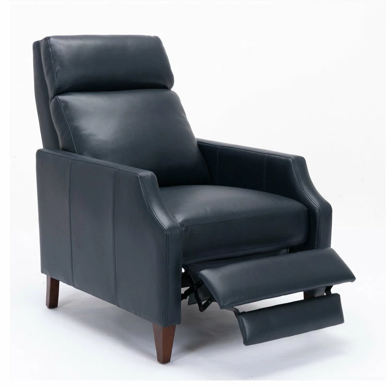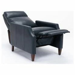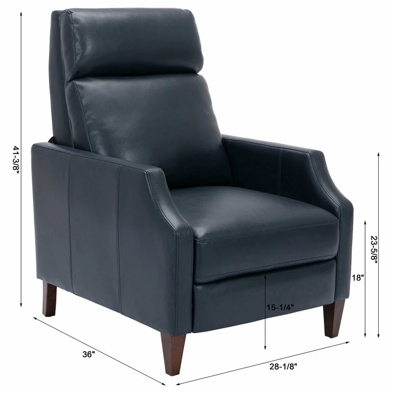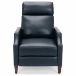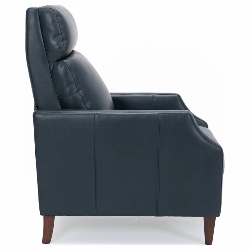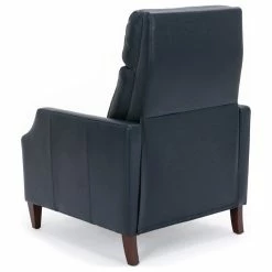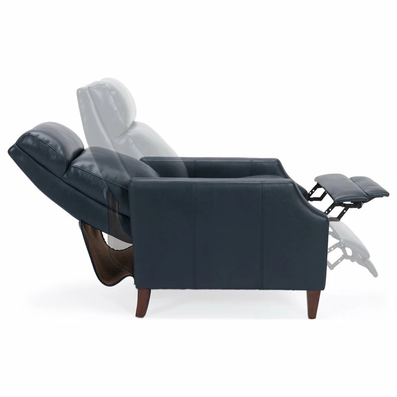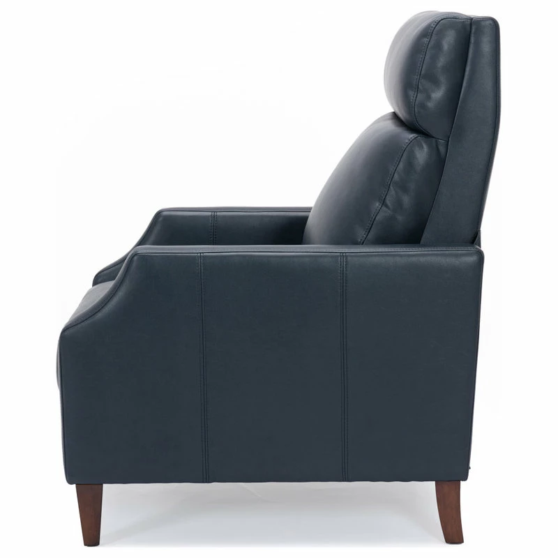 Relax in style in this mid-century silhouette; the Biltmore push-back recliner is as comfortable as it is striking! Upholstered in a soft leather gel technology that gives the look of leather at an affordable price. Easy to clean and long-lasting, this recliner will have you sitting back for hours at a time. Available in Midnight Blue, Burnished Brown or Caramel.