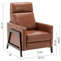 The Maxton Manual Push Back Recliner brings you mid-century modern inspired styling at a great value. This recliner features a trendy exposed wood frame with a high back and pocketed coil seating for ultimate comfort. No levers or buttons keep the silhouette sleek. The innovative leather gel upholstery provides the soft touch of a top grain leather at a great value. Perfect seating for your living room or bedroom where space may be at a minimum. Available in your choice of Midnight Blue, Black or Caramel upholstery. Your purchase includes one manual recliner.