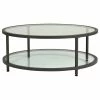American Heritage Round Coffee Table with ShelfInstantly refresh your living room decor with the American Heritage Round Coffee Table with Shelf by Convenience Concepts. Its round silhouette features slightly curved legs along with a bottom shelf. The modern contemporary style will add a simple yet chic touch to your ensemble. With two circular tiers, you will have enough room to store or display your favorite center piece or entertainment essentials. This coffee table is crafted from MDF and solid rubberwood and it is finished with a rich veneer, making this piece durable and easy maintenance. Its assembly is as simple as its design. It requires only 4 steps which allows you to add to your living space right after delivery. Available in multiple finishes, this circle table will become a staple in your home right away. Pair with additional items from the American Heritage Collection by Convenience Concepts. Each sold separately.