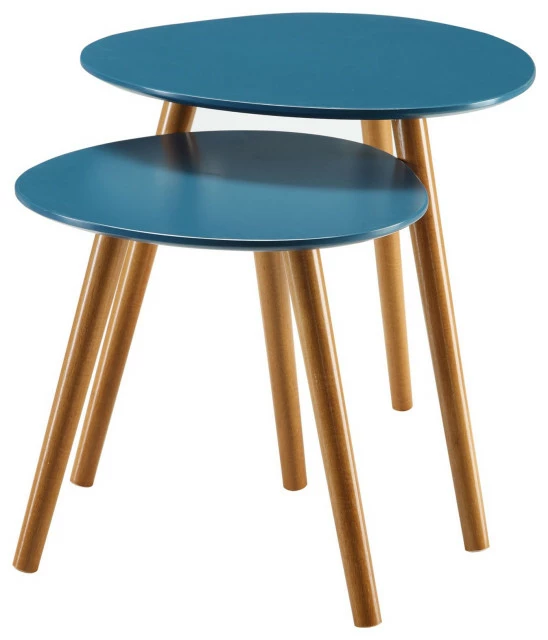Oslo Nesting End TablesInspired by Mid Century Styling the Oslo Nesting End Tables will transform your space. This set of two offers a ton of versatility and functionality. Perfectly nested together you can use the smaller table as an extended surface and tuck it away when you are done or as a completely different unit. This set comes in a variety of finishes from a beautiful satin to a lovely woodgrain finish. Featuring solid wood legs and easy assembly you will have this set together and ready to use in no time! Look for other items from the Oslo Collection sold separately.