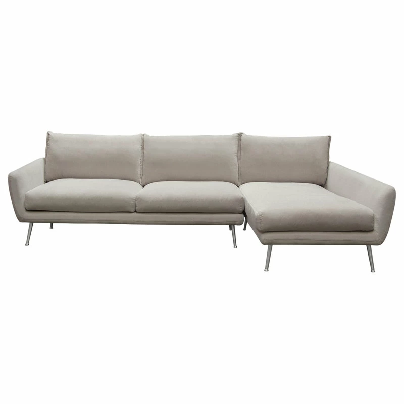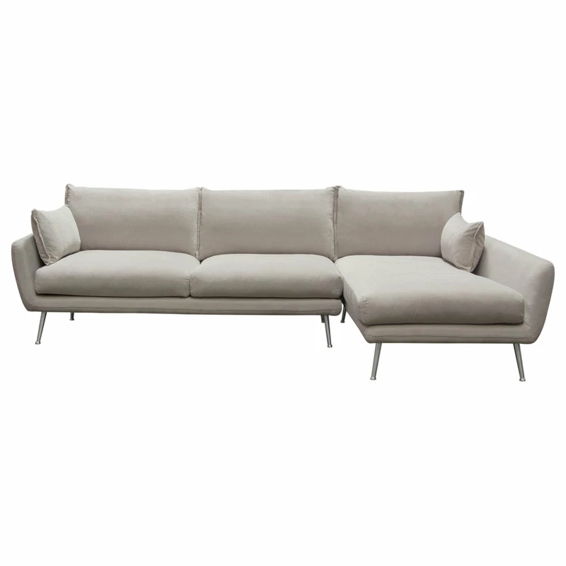The Vantage RF Sectional by Diamond Sofa brings a sophisticated and stunning look to your home’s decor. Angular silhouettes are complemented by the plush Light Flax polyester fabric expertly tailored for a sleek, chic finish. Simple yet elegant, the angular tapered metal legs in brushed finish, will perfectly elevate the style of your space. The Vantage Collection is designed to envelop you in plush, “sink-into” feather down seating comfort for hours of relaxation.