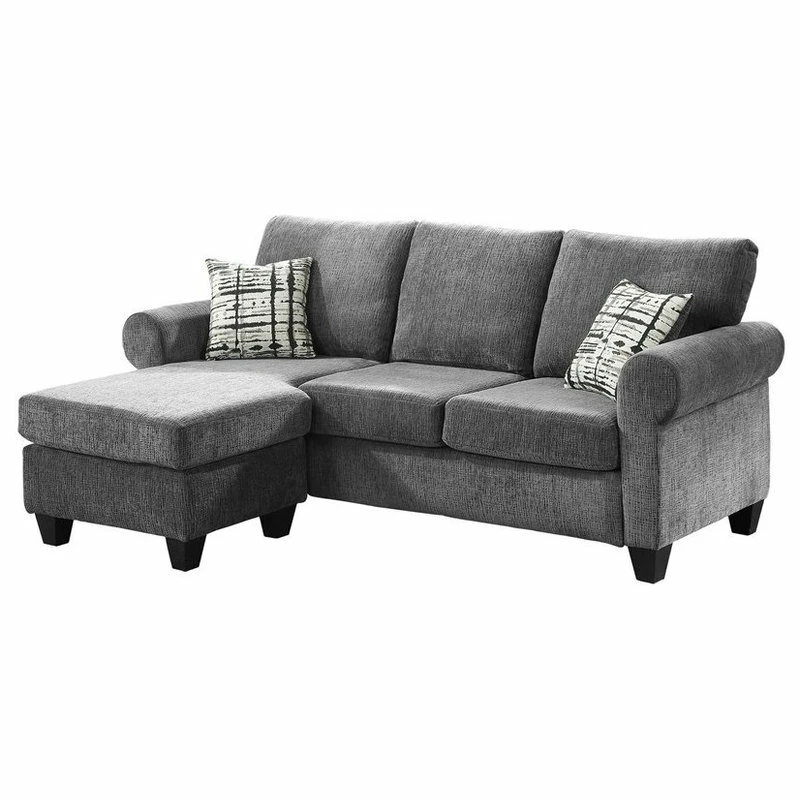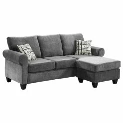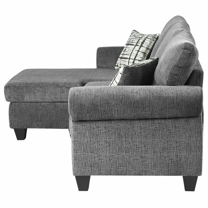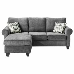 Classic lines create a transitional profile in the design of the Desboro Collection. The sofa-chaise has reversable arms that allow for the seating group to be configured to meet the needs of your space with the ability for left or right chaise placement. The gray chenille fabric upholstery, plush seating, rolled arms and contrasting toss pillows complete the versatile aesthetic.