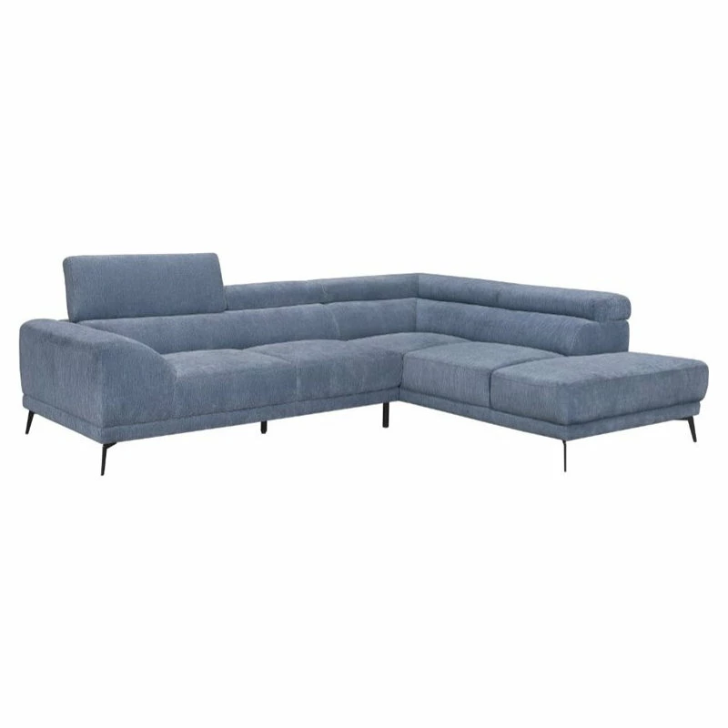 The low profile and sleek styling of the Medora Collection lend modern accent to your living room space. Headrests are adjustable to create a break in the profile of the sofa. The modified chaise provides ample space for relaxation. The blue textured fabric covering and black finished metal legs complete the look of this sectional seating group.