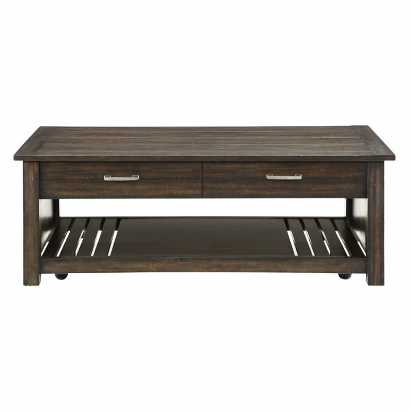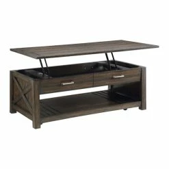 The rustic styling of the Traine Collection presents functional and decorative accent to your living room. Saw marks lend distinct character to the acacia veneer with a distressed industrial brown finish highlighting the wood’s grain. Bar pull hardware fronts the drawers of the cocktail table, while the open display shelf allows for prominent display of your decorative accent pieces. The lift-top of the cocktail table allows for extension to reach your seated position.