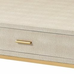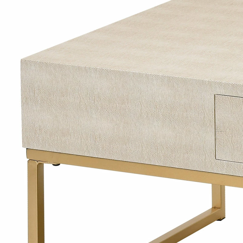 This Les Revoires Coffee Table from Elk has a finish of Cream, Gold, Gold and fits in well with any Transitional style decor. Drawer on back and front. Contemporary faux shagreen wrap. Clean with a soft dry cloth