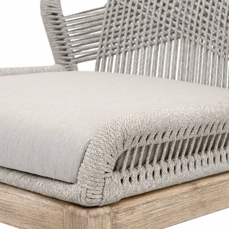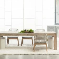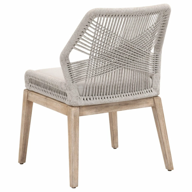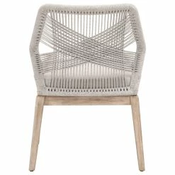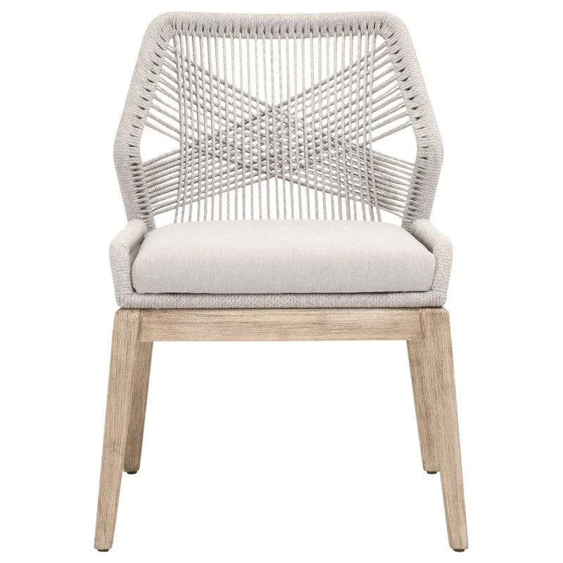 These woven side chairs will add a touch of coastal style to your kitchen or dining space. Constructed with an aluminum frame and solid mahogany legs, these dining chairs are not only sturdy, but durable. A rich taupe and white colored rope is tightly woven to create a unique loom design, while the wood legs have a beautiful distressed natural gray finish. Paired with a removable seat cushion, the chairs provide comfort with style and will be the perfect addition to any transitional or traditional dining room.