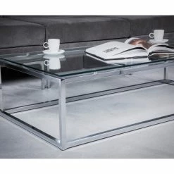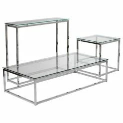 The proportions of these three tables (coffee, side and console) are iconic to say the least. Tops in clear or pure white glass float on perfectly geometric chrome steel bases. We’re talking Museum of Modern art here. Not really. But it’s the right thing to do.