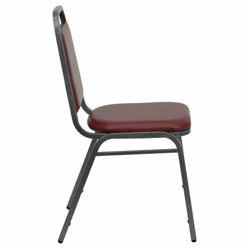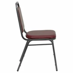 Organize events for any occasion with banquet chairs, these stylish ballroom chairs are the right choice for casual and formal events. Built for the commercial industry these trapezoidal back banquet chairs have been tested to hold up to 500 pounds. With a high seating capacity these stack chairs are perfect for the event rental business. This standout hospitality chair can be used as is and still command attention or be dressed up for formal events by placing a chair cover over it. The chair is cushioned with 1.5″ thick CAL 117 fire retardant foam and is covered in a durable, easy to clean vinyl upholstery. The sturdy frame with gracefully angled legs are made of 16 gauge steel in a lasting powder coated finish. Double support braces reinforce the frame to give it great strength and durability. Bumper guards prevent scratches on the frame when stacked (up to 10 high) and non-marring floor glides protect your floor by sliding smoothly when you need to move the chair. This multi-use stacking upholstered stack chair is an excellent option for churches, banquet halls, training rooms, hotels, convention centers and schools. Add banquet chairs to your home dining table to add a contrasting look to your dining room or kitchen.