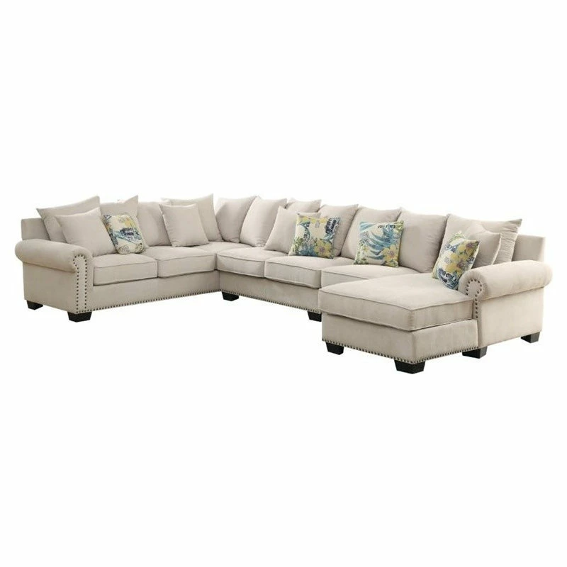 This Beige Fabric Sectional by Furniture of America is framing by gorgeous lustrous nailheads and features beautiful scrolled arms. Foam-filled cushions wrapped entirely in a soft beige fabric upholstery, the pillow back design brings cozy comfort to every part of the sectionals while vibrant patterned accent pillows deliver charming flare. Wooden block feet ensure strength and lasting support as they uphold the spacious solid wood framed sectional. Elevate your living room with the elegant Sectional.