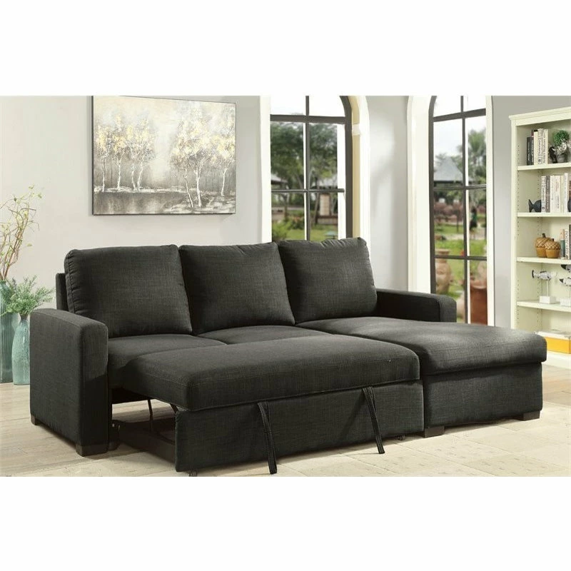 The Rona Sleeper Sectional has you covered for any occasion. With comfy dark gray linen-like fabric and spacious seating, the sectional creates a comforting space to relax and unwind. Pull tabs make it easy to convert the sectional into a bed so you can always be prepared for guests. Stylish and versatile and crafted from solid wood, the Rona Sleeper Sectional a brilliant choice for busy homes.