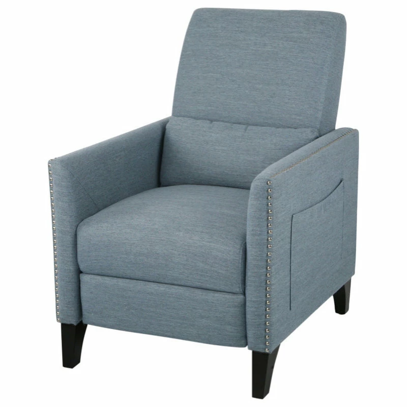 Sit back and enjoy a relaxing evening in our sleek push-back recliner, perfect for unwinding after a long day. This convenient contemporary recliner chair provides an incredibly high degree of coziness in an attractive package. Featuring plush seating and an intricate nailhead trim, this recliner pairs perfectly with the push-back functionality allowing for high comfort with little effort. Sure to become the new favorite spot of leisure, you and your family will surely enjoy this recliner for years to come.