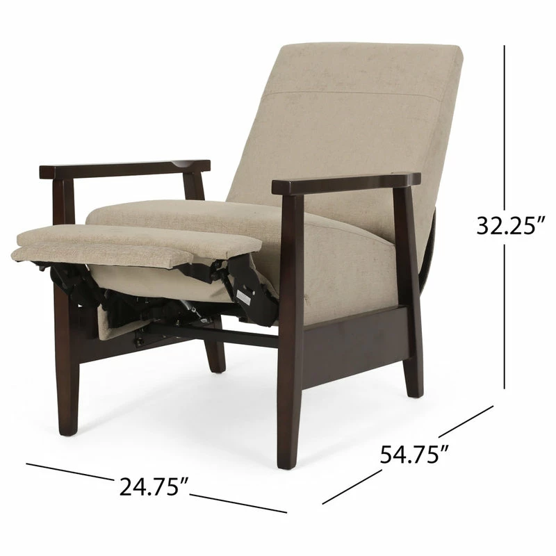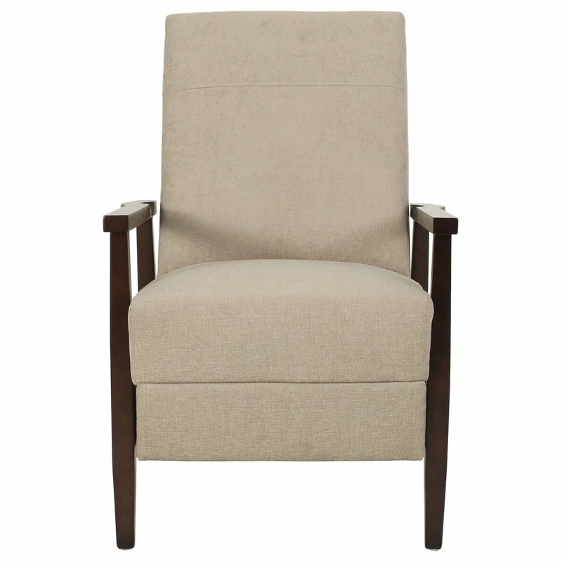 Change the way you relax in your living room with seating that provides great comfort and style. Our convenient recliner chair provides an incredibly high degree of leisure in an attractive package, emphasizing a charming contemporary design with a mid-century modern twist. Featuring smooth upholstery and a rich wood frame, this recliner pairs perfectly with the push-back functionality allowing for high comfort with little effort. Sure to become the new favorite spot of leisure, you and your family will surely enjoy this recliner for years to come.;
