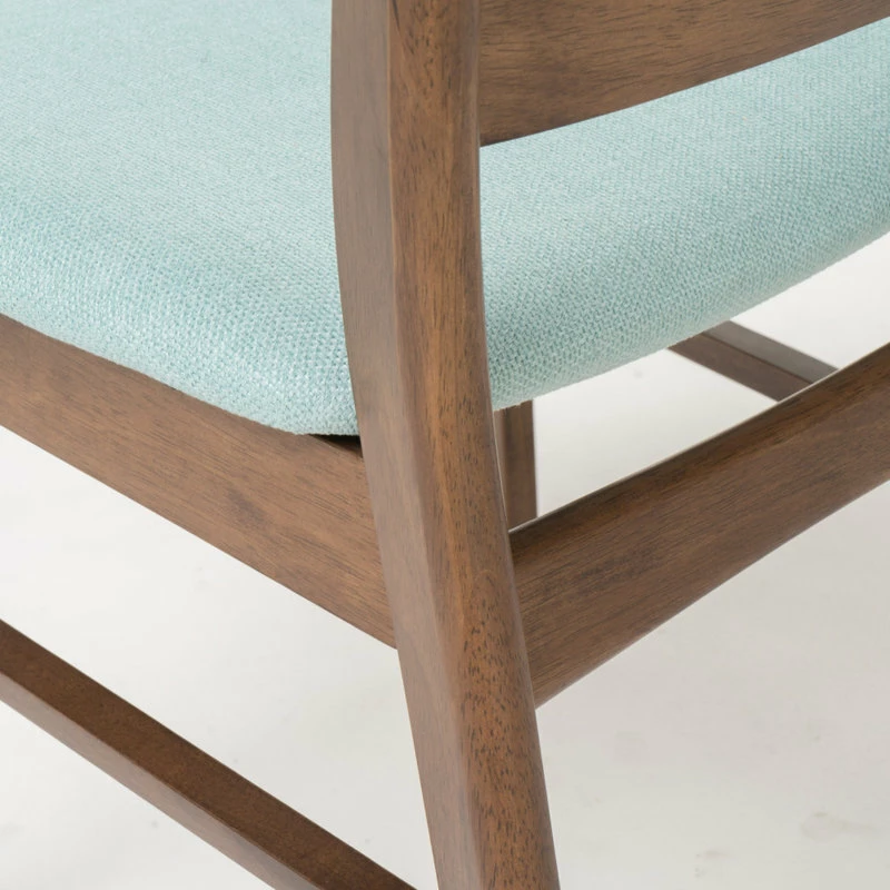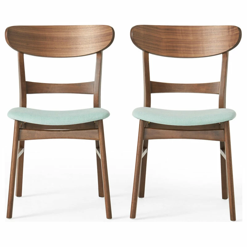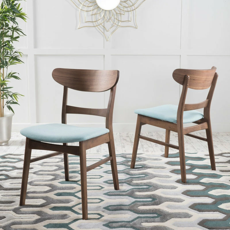 Mid-century modern design makes a stylish appearance in your dining room with these lovely dining chairs. These striking chairs feature soft, upholstered seats and beautifully-finished wood frames. Stunning curves and splayed legs bring even more intrigue and depth to the chic aesthetic. The combination of textures and colors adds dimension to any well-edited space. Fill your dining room with retro charm by pairing these bold and unique chairs with an equally charming dining table, a bold rug, and a coordinating sideboard.