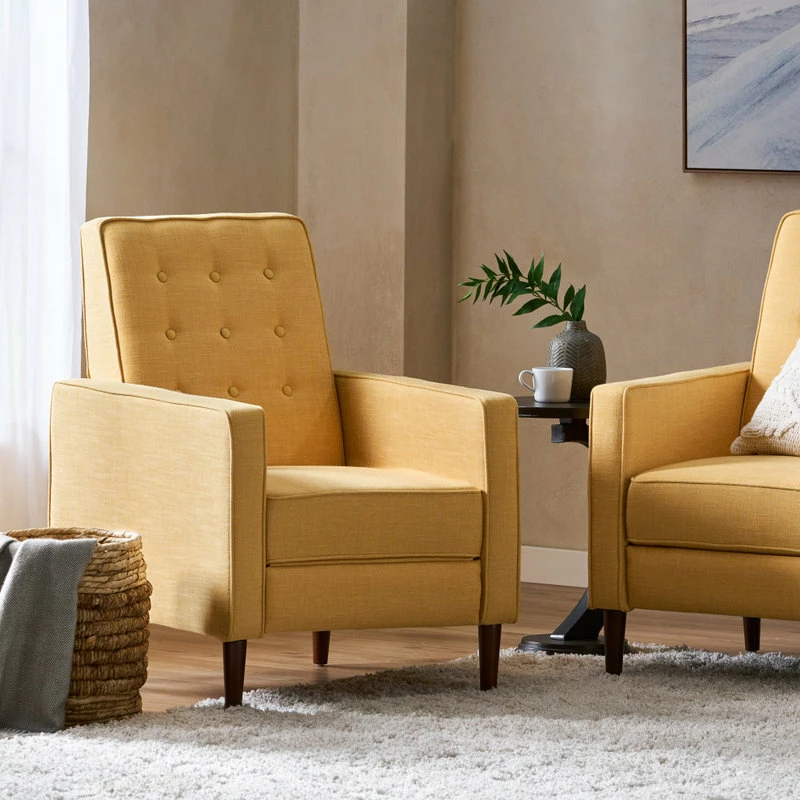 Looking for a place to prop up your feet and relax after a long day of work? Our mid-century modern recliners are a wonderful addition to any living room decor. Featuring clean lines and a smooth finish, these recliners offer you incredible comfort as well as sleek style. This is finished with lovely tapered legs for a sturdy structure and outstanding design. Complete with a beautifully button-tufted backrest and smooth upholstery for maximum comfort, these recliners will easily turn into your favorite place to unwind.