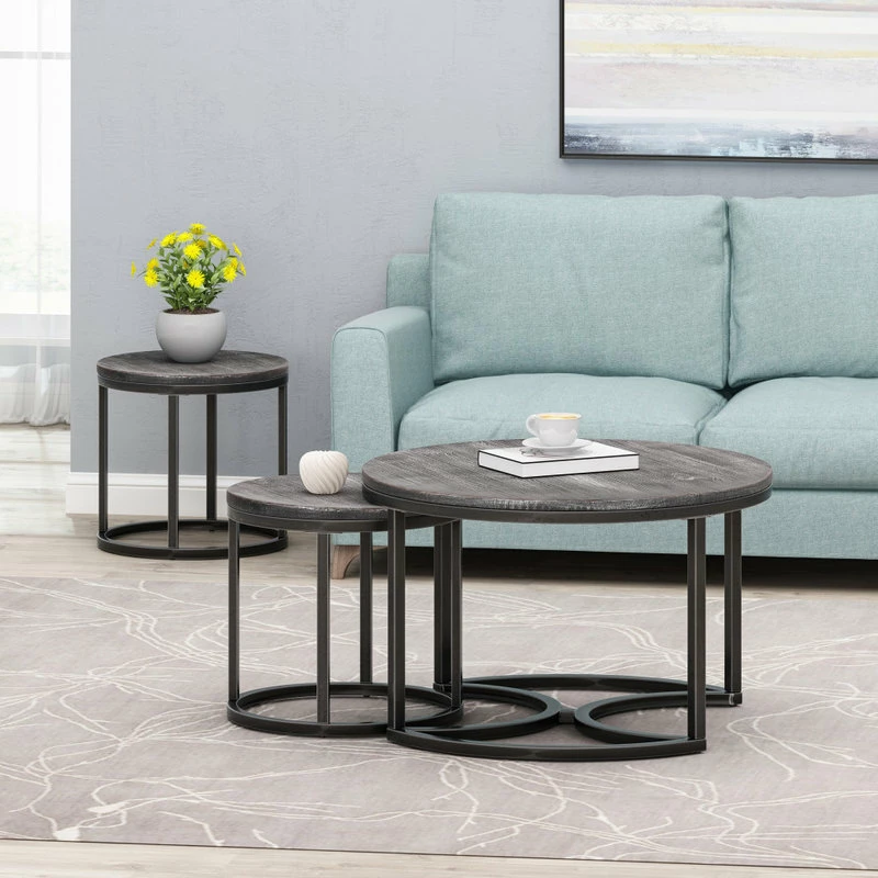 Short on space? Have no worries with our incredibly functional modern industrial set of nesting tables. Including one coffee table and two side tables, you can bring the party to life with plenty of space to set snacks, decorative displays, or a lamp or two. When your guests have gone and you need your living room back, you can simply tuck these tables together for easy storage. Built with sturdy iron frames and finished with wire-brushed firwood tabletops, this set will provide outstanding durability and style for years to come.