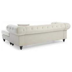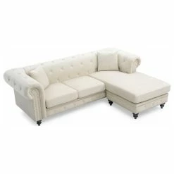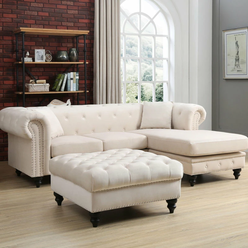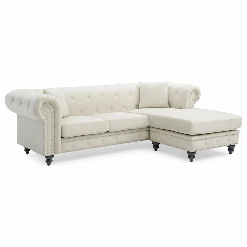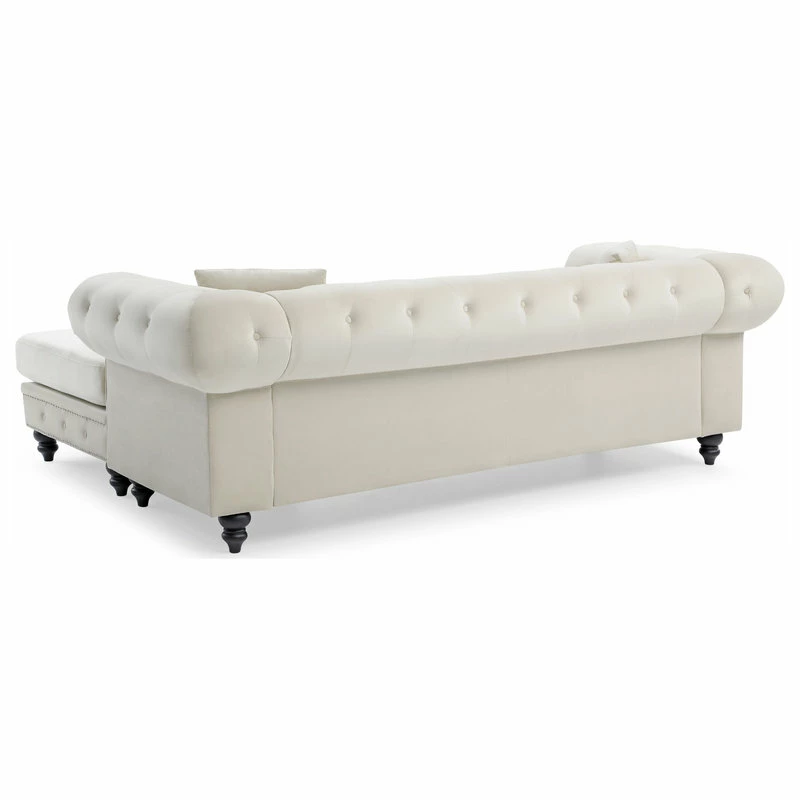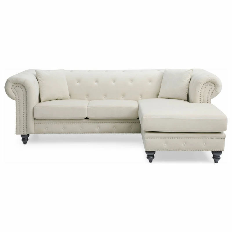 Dramatic Chesterfield Sectional features Soft Velvet Cover Tufted On Front and back as well as Bottom Rail. Chrome Nail-heads and Wood Legs are also included. Pocketed Coil Seating provides a medium Firm feel with long lasting durability. Two Matching Throw Pillows are also included. Available in a choice of colors as well as a Matching Ottoman can be purchased separate.