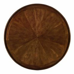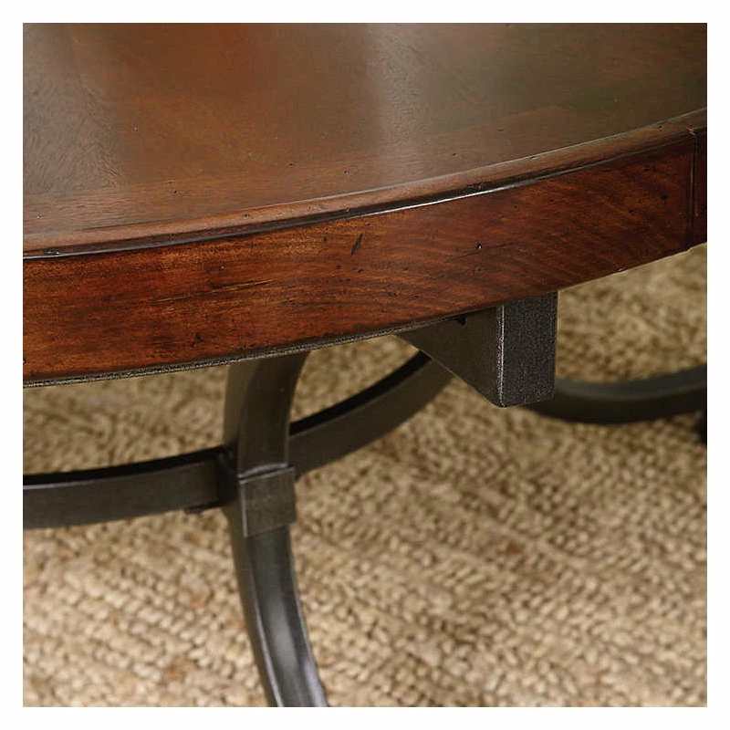 - Round tabletop adds richness with an amber finish and wood patterning.
