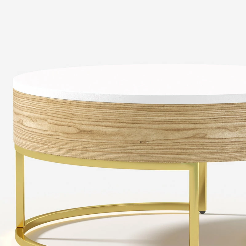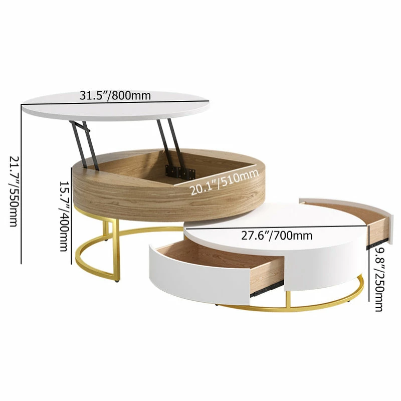 A distinguished piece to enhance any decor and provide maximum versatility for your living space. This round coffee table features a lift-top design that can be lifted to provide the perfect height for writing, reading or drinking. The small table can be adjusted under the large table that optimizes the space available or can be used separately. Comes with 2 rotatable drawers and hidden storage, this coffee table offers ample space to store magazines, remote control, toys or your little secret. Made of manufactured wood and metal, it ensures sturdy construction and steady support.