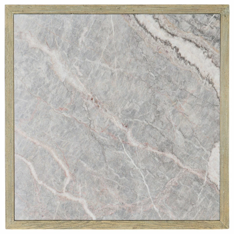 Inspired by the rugged and picturesque Malibu landscape, the Surfrider Cocktail Table combines hardwoods and stone veneers with a modified X-motif fretwork on the sides for a sophisticated casual appeal. The stylish square-shaped table contrasts a honed stone veneer top with the light natural Driftwood distressed finish.