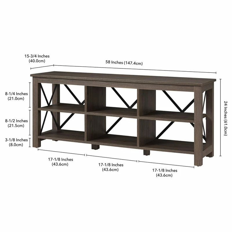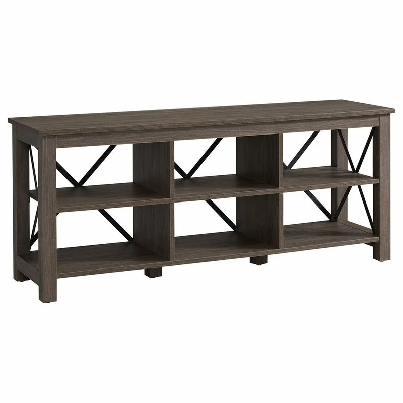 Strong geometric lines set this modern farmhouse-inspired TV stand apart. Its X-shaped black metal accents offset the rich wood tone, creating a warm neutral color palette that will blend seamlessly into any design scheme. A must-have for living areas and entertainment spaces, this TV stand sets the stage for the big game, a movie marathon, or that season finale everyone�s been talking about.