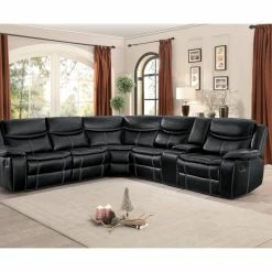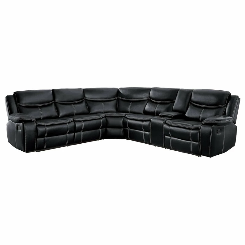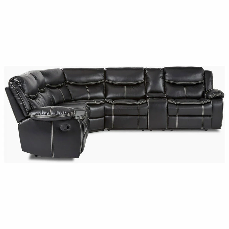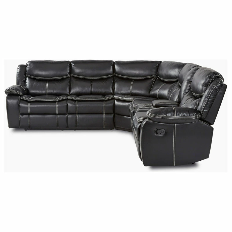 Comfort is the name of the game in the Arden Collection. The collection is offered in two configurations traditional sofa, love seat and chair, and sectional for versatile placement in your living room maximum relaxation potential in your downtime. The two optional coverings black or brown leather gel match feature contrast welting for definition of profile and modern accenting. Manually engaged motion mechanisms allow for quick transition from seated to prone with the quick pull of a tab. Each piece in the collection has an individual function allowing for convenience and comfort. The sofa features dual reclining ends, the dual glider reclining ends of the love seat flank a center mounted console with storage and cup-holders, and the chair features a glider mechanism that allows for easy back and forth motion. The sectional configuration features a left side love seat with reclining end and the right side double reclining love seat with center console unit featuring cup holders and storage.