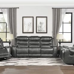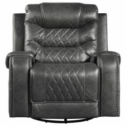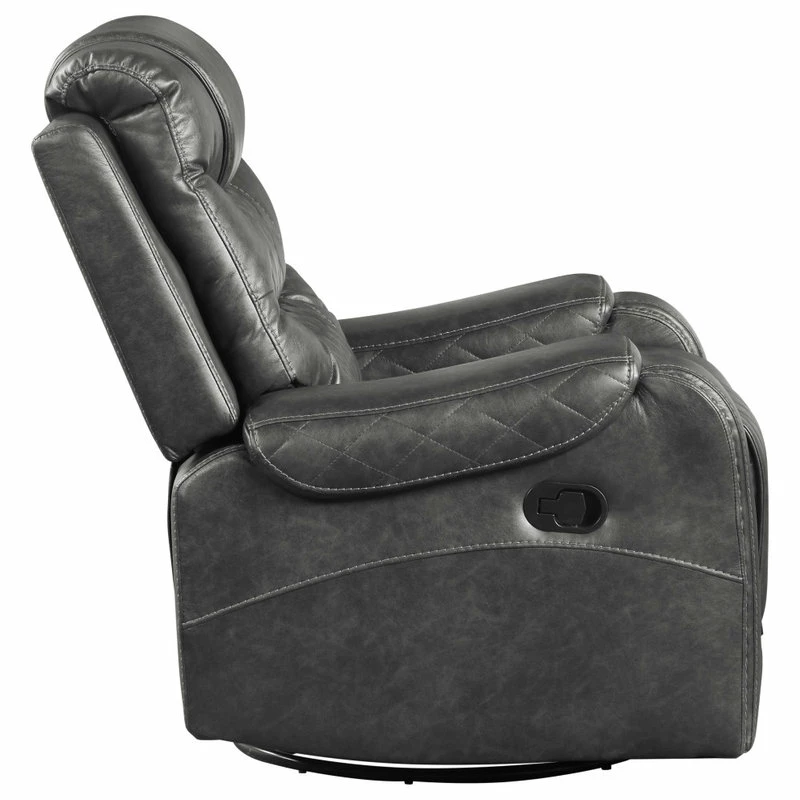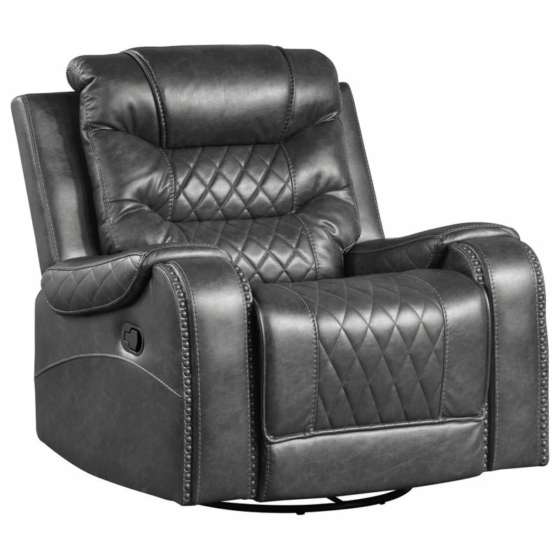 The Greenway Collection will serve as a functional, stylish, and comfortable seating group for your living room. The swivel glider chair features manual reclining mechanisms allowing for perfect placement and function within your available space. The Greenway Collection is offered in gray faux suede fabric with diamond pattern stitching with nailhead-adorned arms for classic decorative effect.