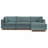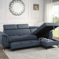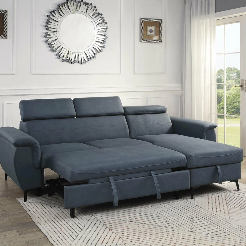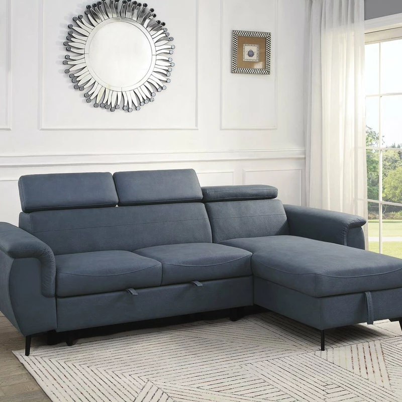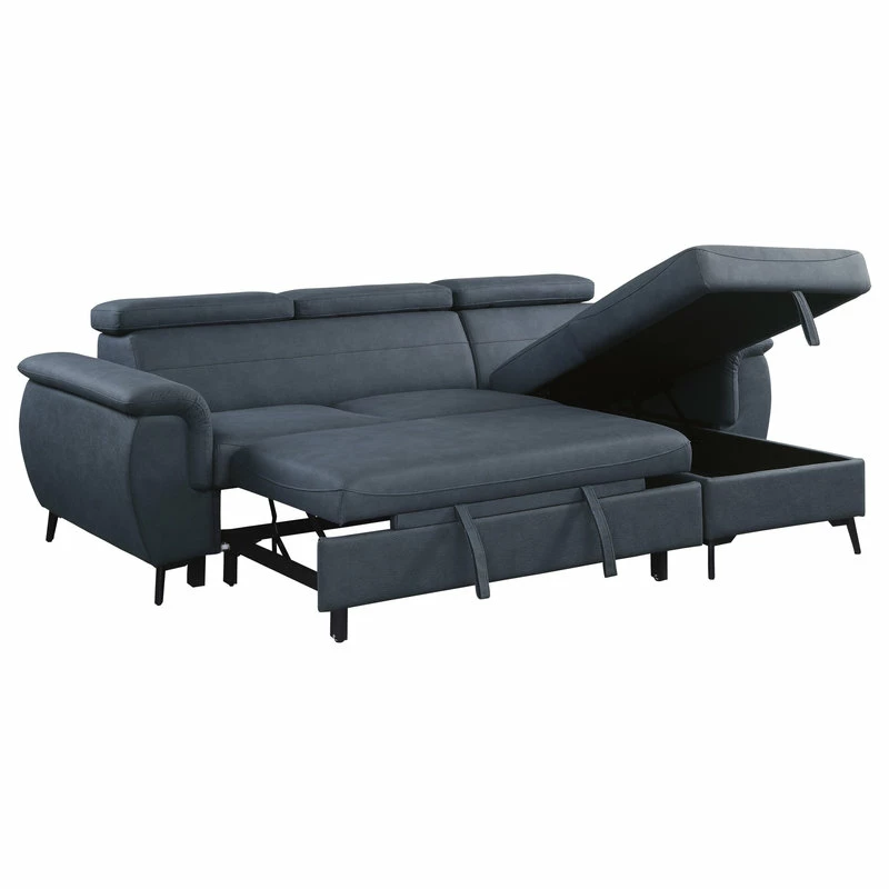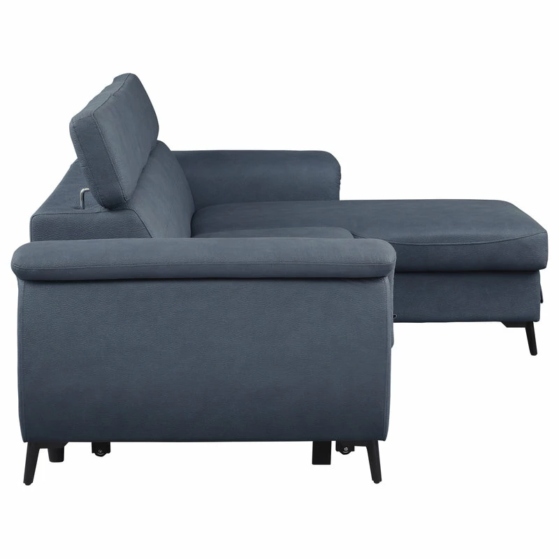 The low profile and sleek styling of the Michigan Collection lends modern accent to your living room space. Headrests are adjustable to create a break in the profile of the sofa while the chaise can be configured for right or left side placement, allowing for perfect placement within your living room. The pop-up chaise provides ample space for relaxation as well as provides storage within the unit, and the pull-out pop up ottoman extends your sectional into a larger platform. The blue microfiber covering pairs with black finished metal legs completing the look of this sectional seating group.