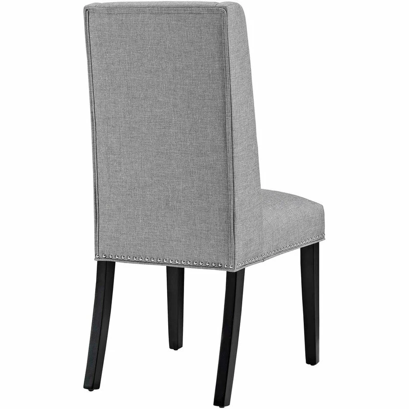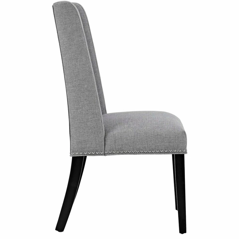 Explore the vast riches of a treasured heritage with the Baron Dining Chair. Designed to resonate elegance, Barons features a charming back and polished nailhead trimmed seat with a dash of grace and noble appeal. Complete with dense foam padding, fine fabric upholstery, solid wood frame and legs with non-marking foot glides, Baron is a stylish dining chair perfect for the modern home.