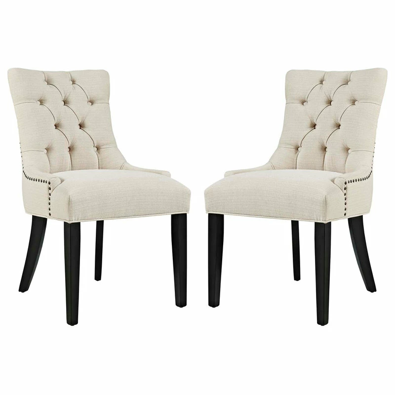Transport your decor to a simpler time with the Regent Dining Side Chair. Fashioned with a chic and elegant look, Regent features finely tufted buttons, studded nailhead trim, and a regal seat generously padded in foam and upholstered in polyester fabric. Regent comes with non-marking foot caps, tapered wood legs, and works well in both modern and traditional dining rooms.