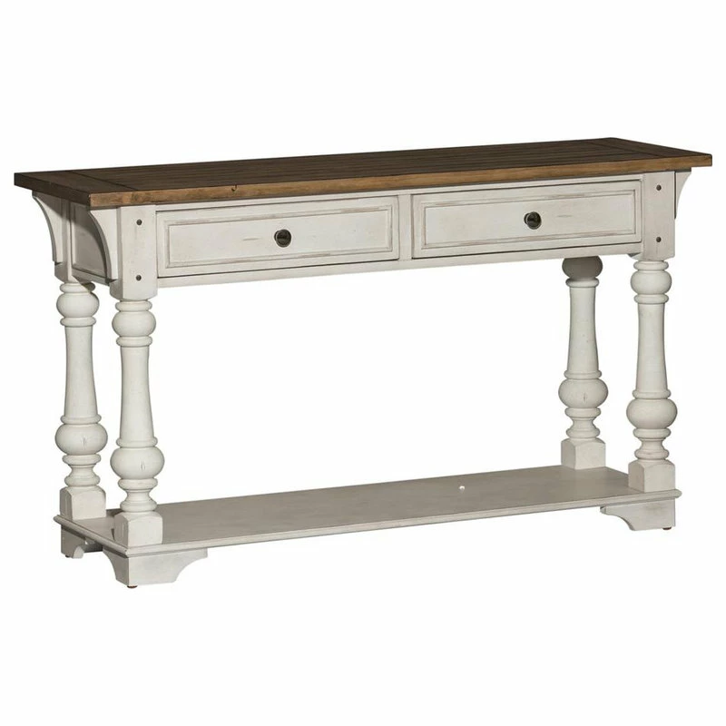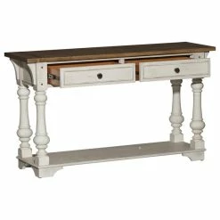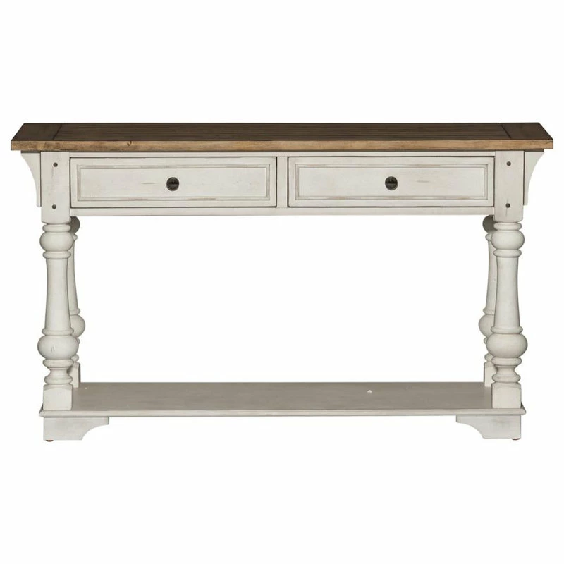 Elevate your space with the Morgan Creek sofa table. Crafted of poplar solids with pine and birch veneers, this piece features an antique white finish with spatter and watermark accents and a wire brushed tobacco planked top, appealing pewter nail head corner accents, and two full extension drawers with a bottom shelf for additional storage, anchored by round turned legs flowing into bracket feet. This gorgeous sofa table will bring a luxurious feel to any traditional space.