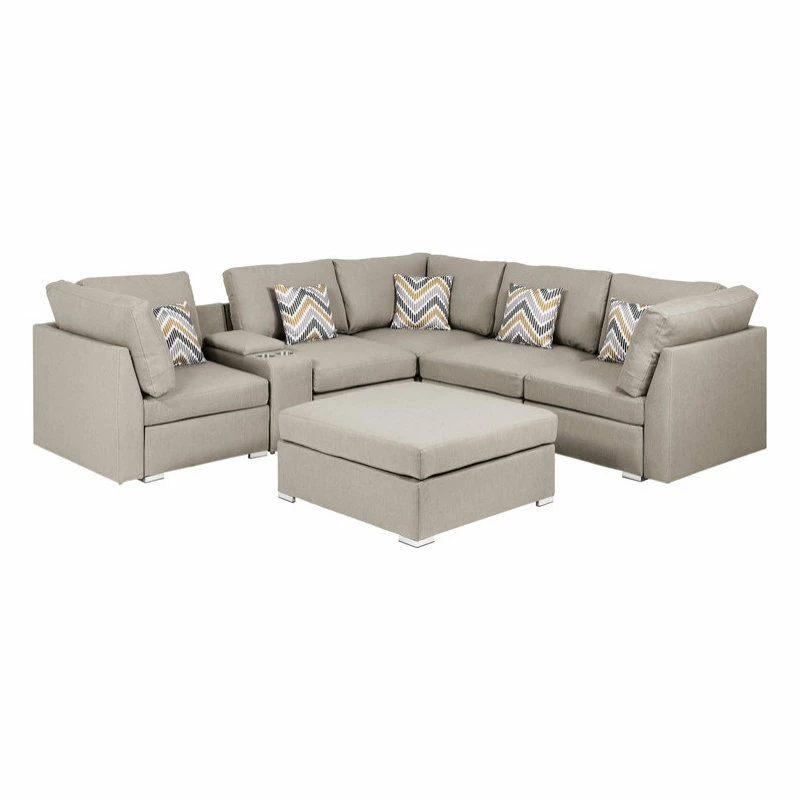 Comfort, Style, and Quality! These are the important features for the Amira Collection. This beautiful modular sofa sectional couch with USB console with cupholders, ottoman, and five matching accent pillows will fit into any living room and impress your guests! The comfortable beige linen fabric with matching accent pillows will light up your living room with the most trendiest of looks. Perfect for apartments, condo, loft, and single family home, you will be able to welcome multiple guests comfortably where everyone is able to enjoy entertainment together.