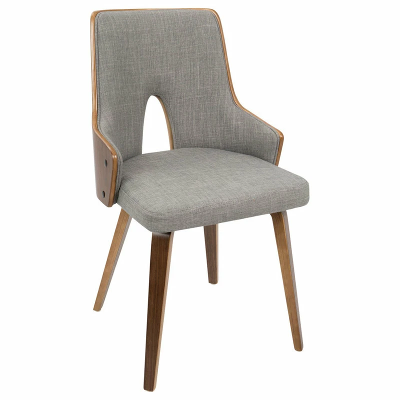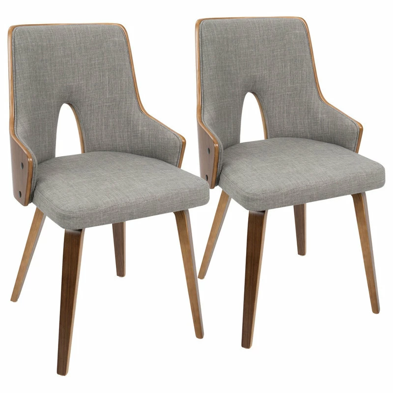 Enjoy the plush style and comfort of the Stella Chair. A padded backrest and seat are upholstered in woven fabric and accented by walnut-finished bent wood back and legs. Choose from grey or green to accent your home decor. FeaturesPriced And Sold In Pairs; Indoor Use Only, 250 Lbs. Weight Limit (Each), Assembly RequiredMid-Century Modern styling Polyester Fabric Upholstery Includes 2 chairs Walnut wood finish Sturdy bent wood frame constructionRome of Use: Great for use in kitchen, bar, or break roomCollection: StellaColor : Walnut, Light GreyMaterial: Wood, Polyester Fabric, FoamProduct Dimension: 22.5″L x 19.5″W x 32.75″HSeat Dimension: 17″D x 17″WSeat Back Height: 15.5″Seat Back Angle: 99Seat to Floor: 18.75″Made in China