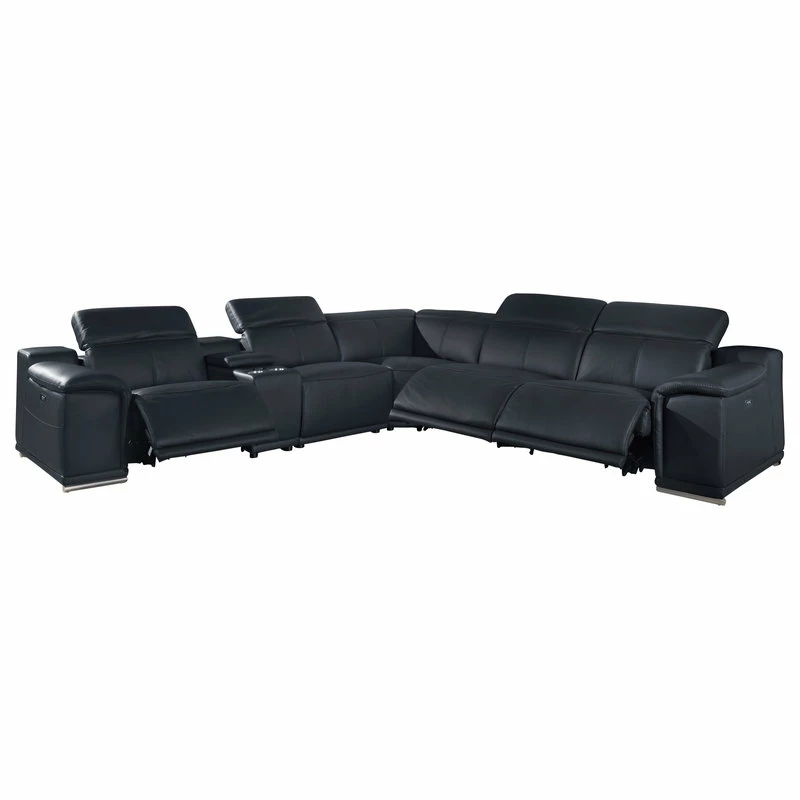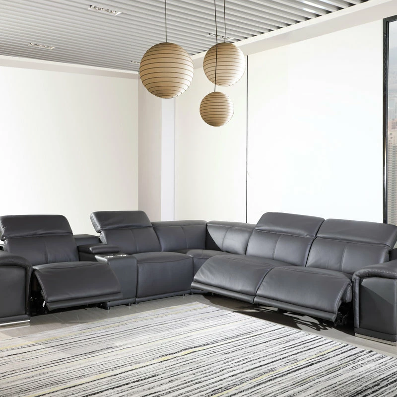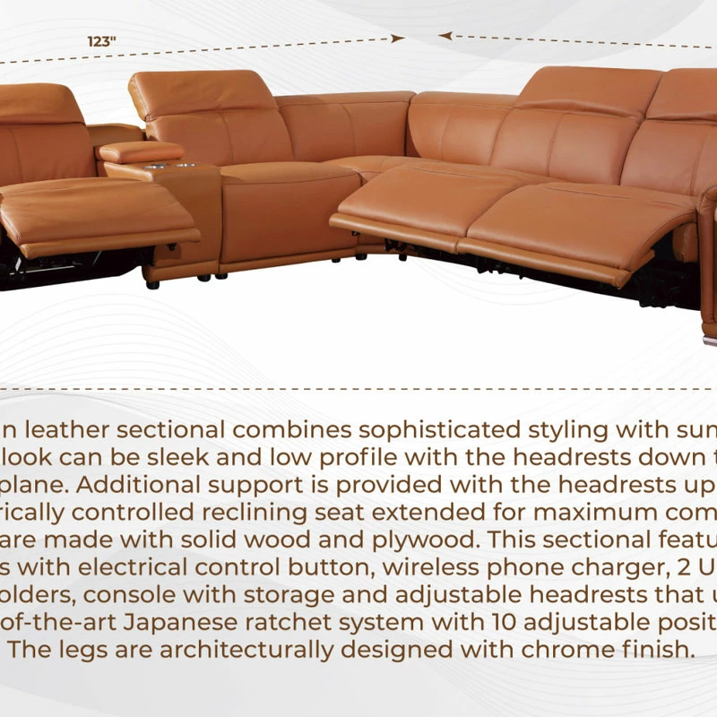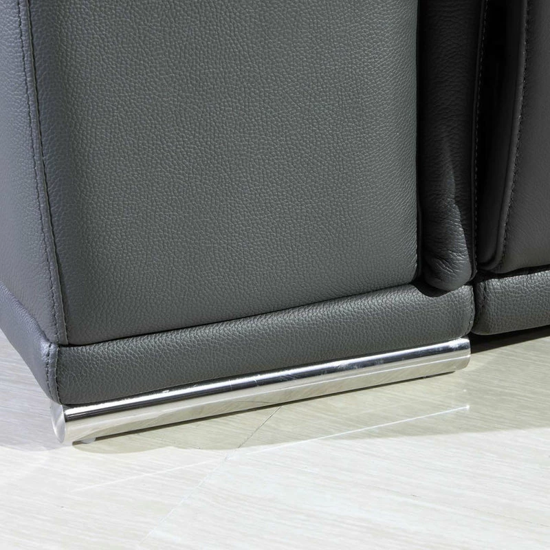 Enjoy modern style and top-notch relaxation with this Italian Leather Reclining Modern Sectional. This beautiful sectional features comfortable seat cushions, plush back and headrest, pillow arms, and Genuine Italian Leather upholstery. The elegant design and exquisite cushioning provide perfect comfort that will keep you cozy, and the extra padded arms add the perfect finishing touch. This Reclining sectional will transform your living room with its modern design. It displays an aesthetically pleasant linear design with chrome accents to foster sophistication. A great way to convey simple luxury in any room. Mindfully designed with gentle arms, & plush high density seat cushions for maximum comfort, this masterpiece is a delightfully distinguished mix of functionality and style. The chrome legs effortlessly elevate any room with a touch of contemporary design.
