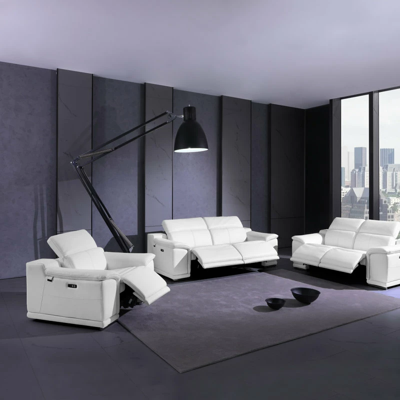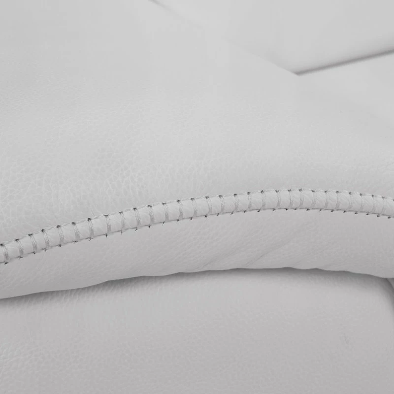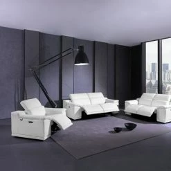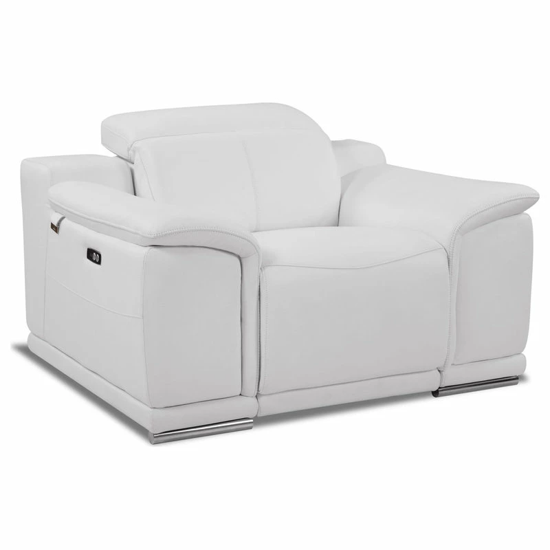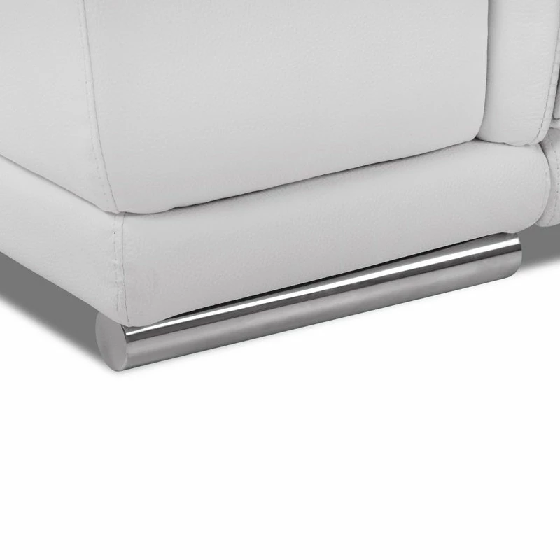 Enjoy modern style and top-notch relaxation with this Veneto White Leather Reclining Chair. This beautiful Veneto Chair has comfortable seat cushions, plush back and headrest, pillow arms, and White Genuine Leather upholstery. The elegant design and exquisite cushioning provide perfect comfort that will keep you cozy, and the extra padded arms add the perfect finishing touch. Veneto Chair will transform your living room with its modern design. It displays an aesthetically pleasant linear design with chrome accents to foster sophistication. A great way to convey simple luxury in any room. Mindfully designed with gently arms, and plush high density seat cushions for maximum comfort, this masterpiece is a delightfully distinguished mix of functionality and style. The chrome legs effortlessly elevate any room with a touch of contemporary design.