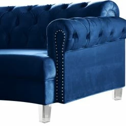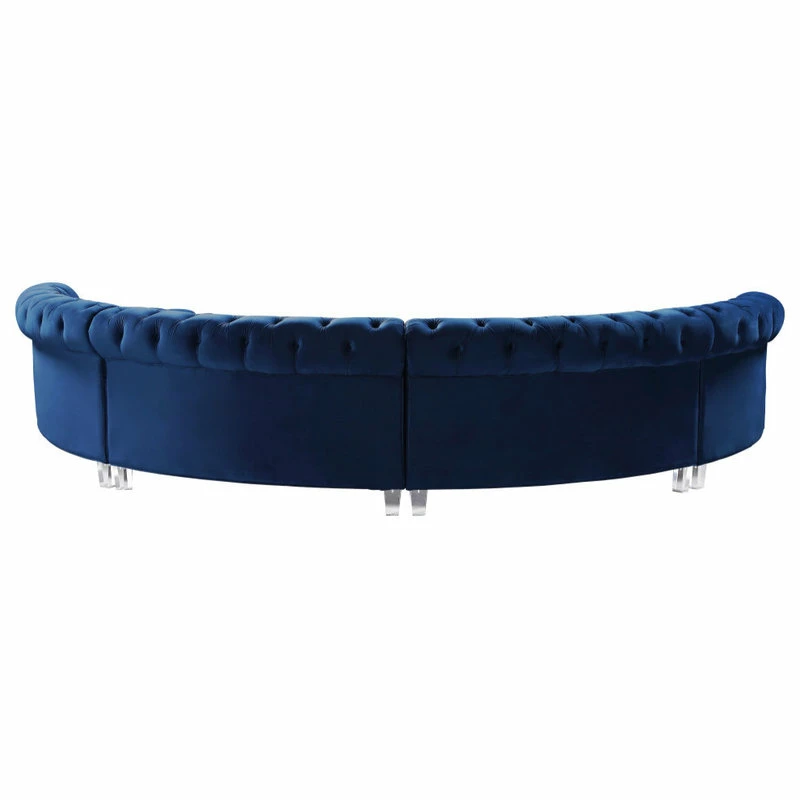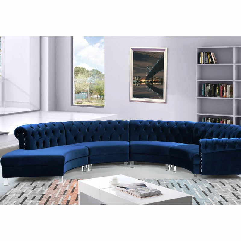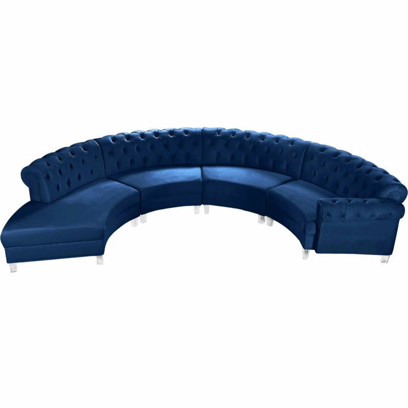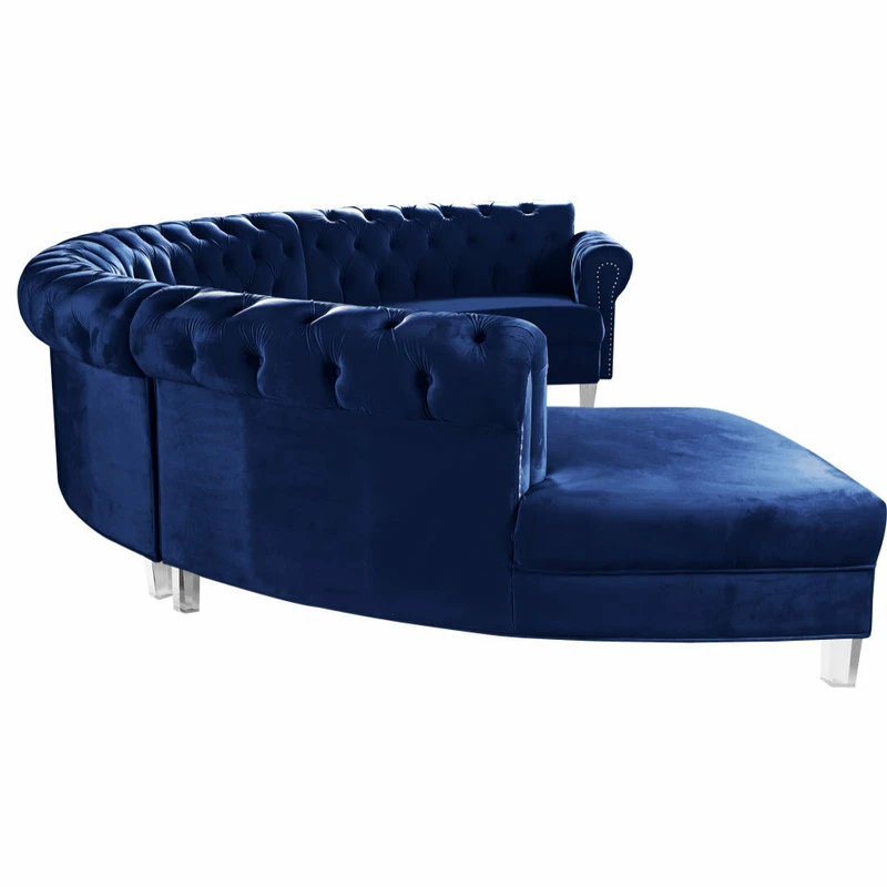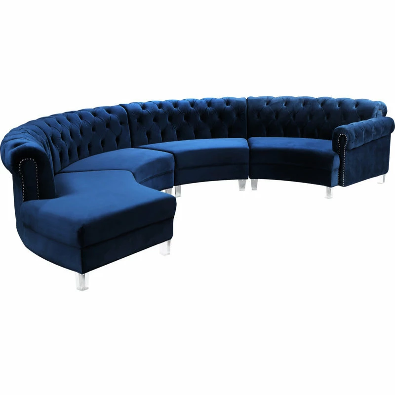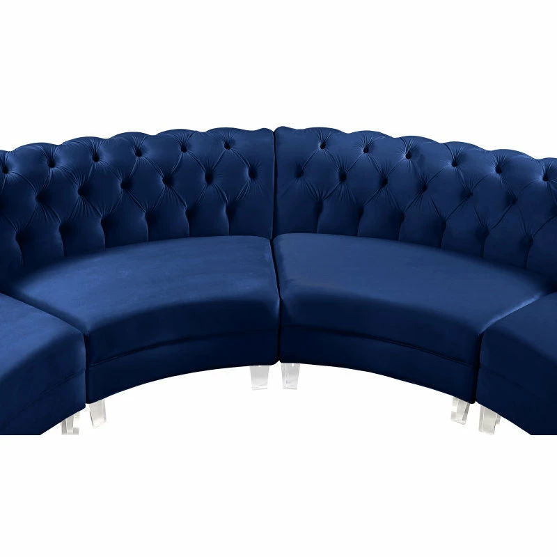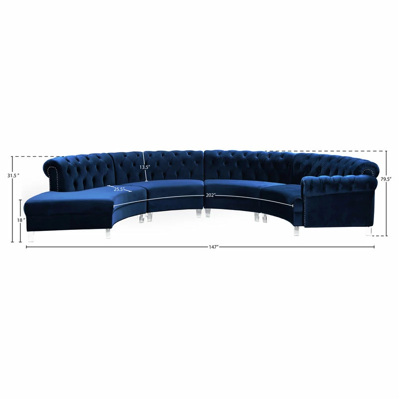 Sit back and relax after a long day at work on this Anabella Navy Velvet 4pc. Sectional from Meridian Furniture. Rich navy velvet upholstery is complemented with deep tufting and chrome nailheads, creating a contemporary piece that’s perfect for any room in your living space. Acrylic lucite legs finish off this elegant sectional’s design, providing its frame with sturdy support as well as balance for its luxurious navy color.
